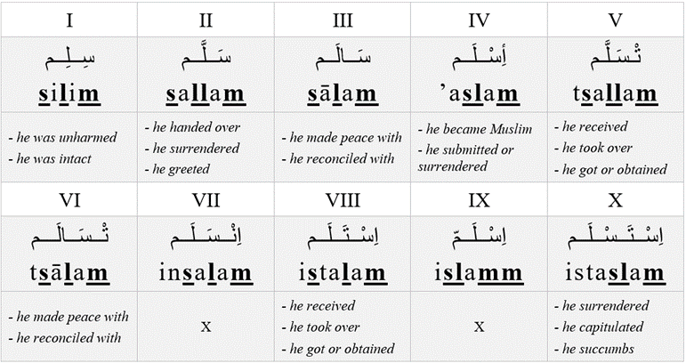 By replacing the radicals in the template root ف – ع – ل (f – ‘ – l) with the radicals س – ل – م (s – l – m), we derive the following verbs: